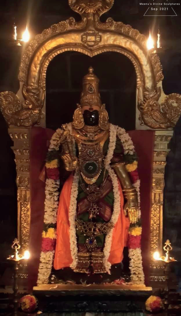 She was endowed with extraordinary yogic powers, infinite qualities and energies. Also named “Thadathagai” (warrior princess)” and “Angayarkanni”, and with a regal upbringing beyond even that of the most valiant of princes, she was the Queen of the blessed Pandyan empire headquartered at Madurai city, the city created by the divine couple Devi Meenakshi and Lord Sundareśvara. Ruling for a considerably long period, she elevated the Meenakshi Sāmrājya (Rule of Mīnākṣi) with cosmic justice, and extended the divine empire in all directions, ruling with extraordinary administrative acumen.