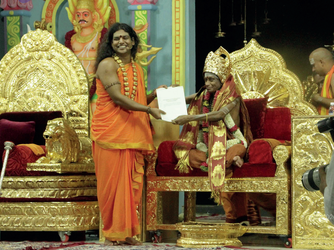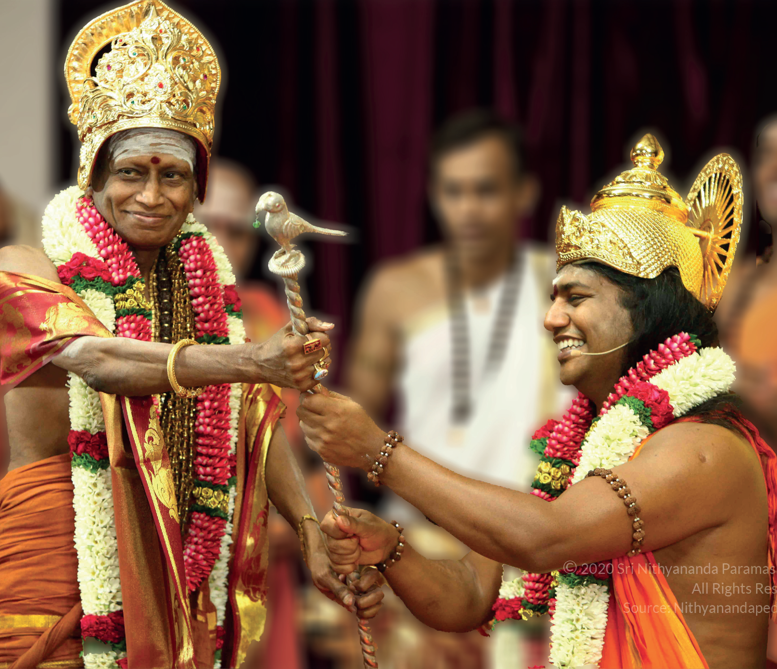 After centuries of destruction, on the 27th of April 2012, in a landmark event in the history of Hinduism, THE SPH BHAGAVĀN ŚRI NITHYĀNANDA PARAMASHIVAMwas coronated as 293rd Pontiff of the Shyamalapeeta Sarvajnapeetha. The 292nd Guru Maha Sannidhanam, who knew THE SPH well for many years, conveyed to THE SPH that he received a divine mandate from Mīnākśi and Sundareśvara themselves to crown THE SPH as his next successor. To execute his divine order at once, he offered THE SPH the silver sengol, a ruling staff of Mīnākśi, to symbolize that THE SPH was officially chosen as the next successor of the Kingdom of Shyamalapeeta Sarvajnapeetha. Within a month, the legal and functional arrangements were made, and as a result a change in the course of history was masterfully orchestrated, for the lineage that started with Paramaśiva and Mīnākśi, was once again in their hands through the embodiment of their Divine energies, THE SPH.