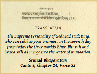 ” The Supreme Personality of Godhead said: King, who can subdue your enemies, on the seventh day from today the three worlds-Bhur, Bhuvah and Svaha-will all merge into the water of inundation.