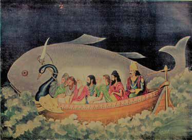 On Earth many more years passed, but in time, as Maha Viṣṇu had foreseen, sea levels had risen and the clouds began pouring water unlike ever before seen. When an ark appeared before the King, he boarded the ship with all the items that he collected. Viṣṇu, as Matsyavatāra assumed the form of a humongous and divine fish once again and pulled the ship through